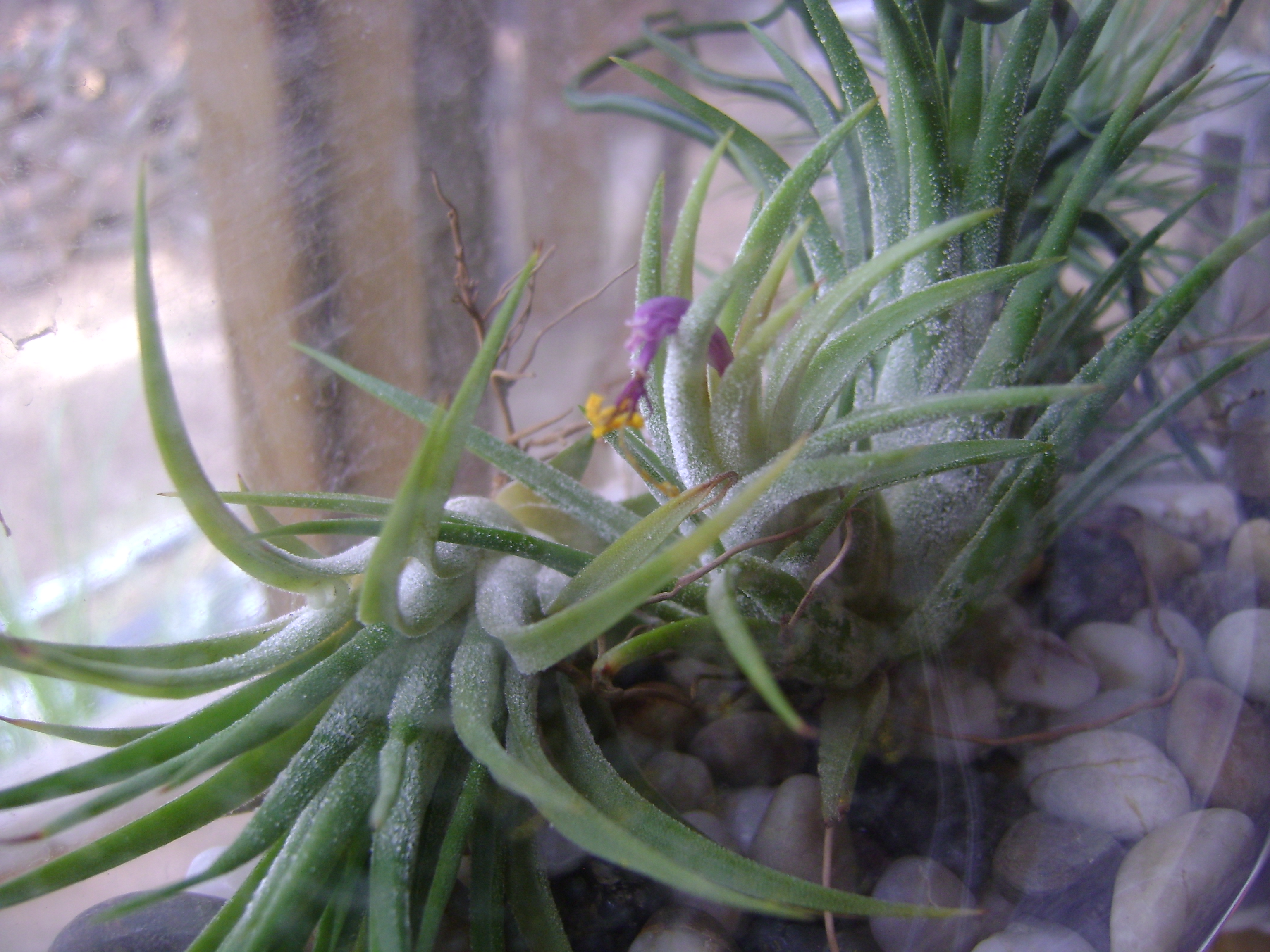 I love my air plants! These things take in the water they need through their leaves rather than their roots. As you can see I have mine sitting on top of rocks in a wall mounted fish bowl. I have seen them wired onto trees, glued onto driftwood, hanging from fishing line and sitting in bowls. The display possibilities are endless. They love warm, humid climates and that pretty much sums up South Carolina weather for half of the year. And since they only need indirect sunlight they do well in my shad covered yard or inside near a window.
