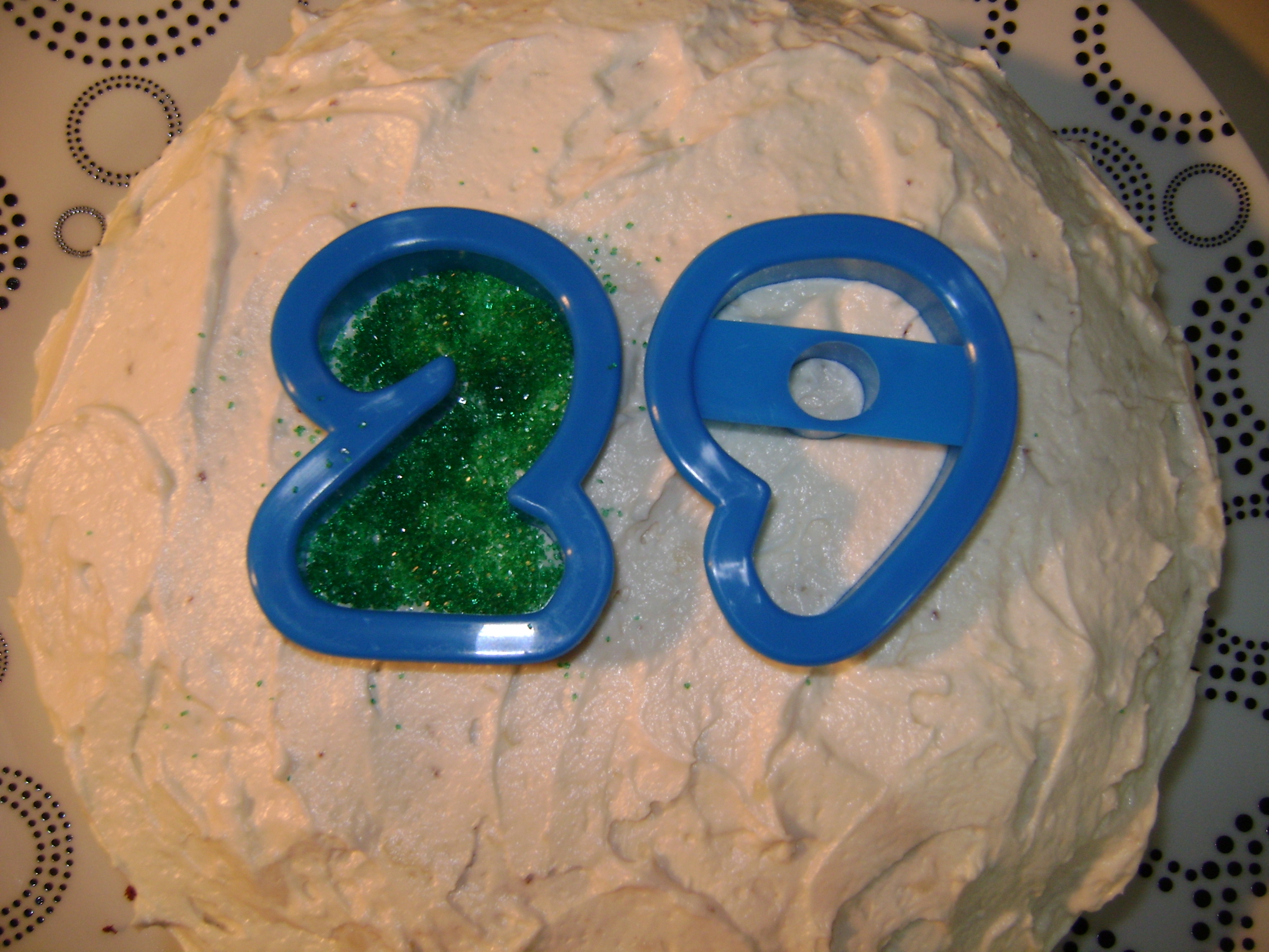 Oh, and one last thing. If you are like me and the thought of writing on a cake with frosting is overwhelming because you struggle just to write nicely on paper using a pen……then perhaps you may want to try this little trick. I used cookie cutters as stencils and sprinkled a layer of colored sugar inside of them. I suppose you could do the same thing with frosting, I’ve just never tried.
