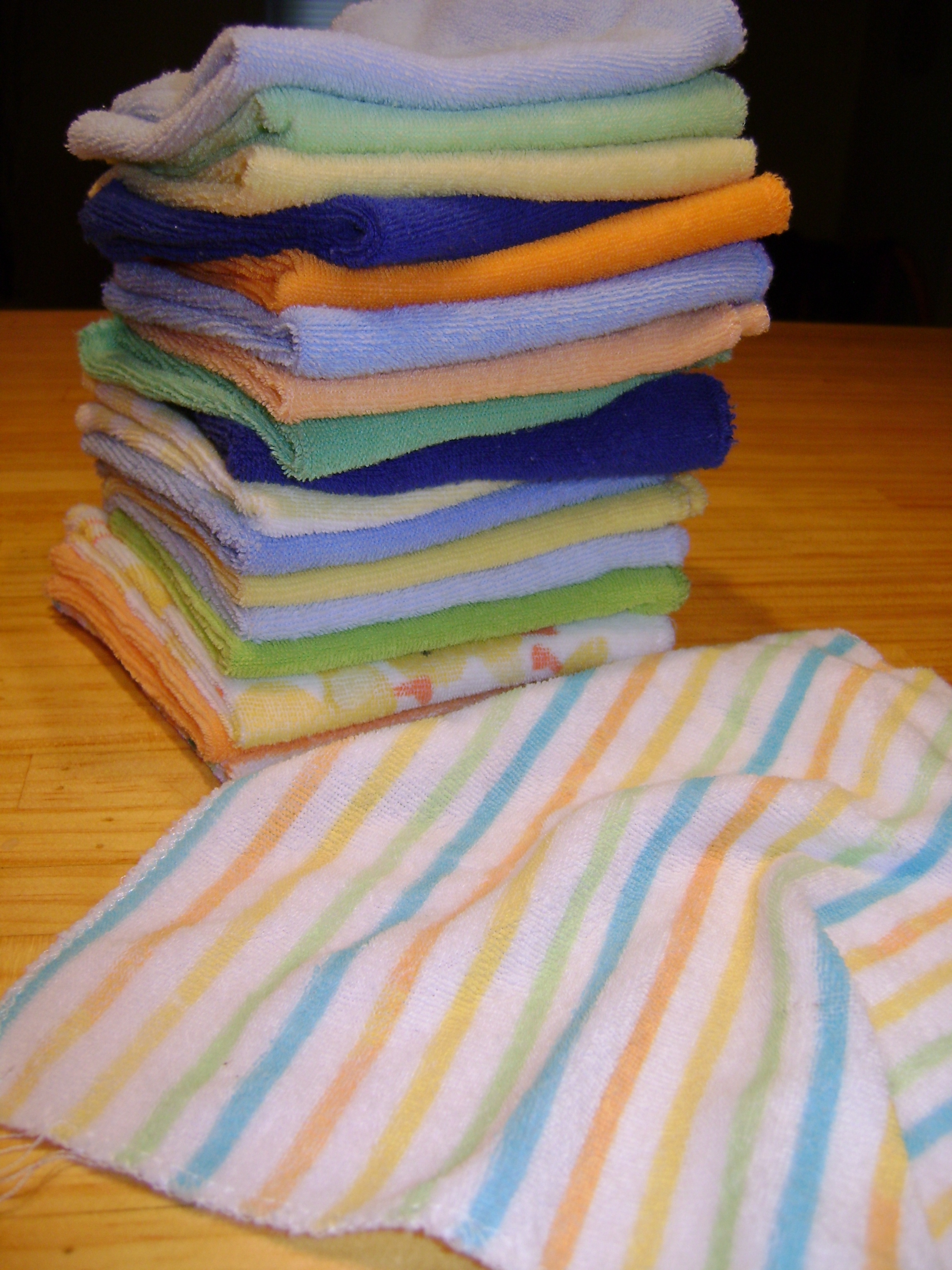 - Baby washcloths (my favorite) – You can buy packages of 8”x8” light weight, terry washcloths.