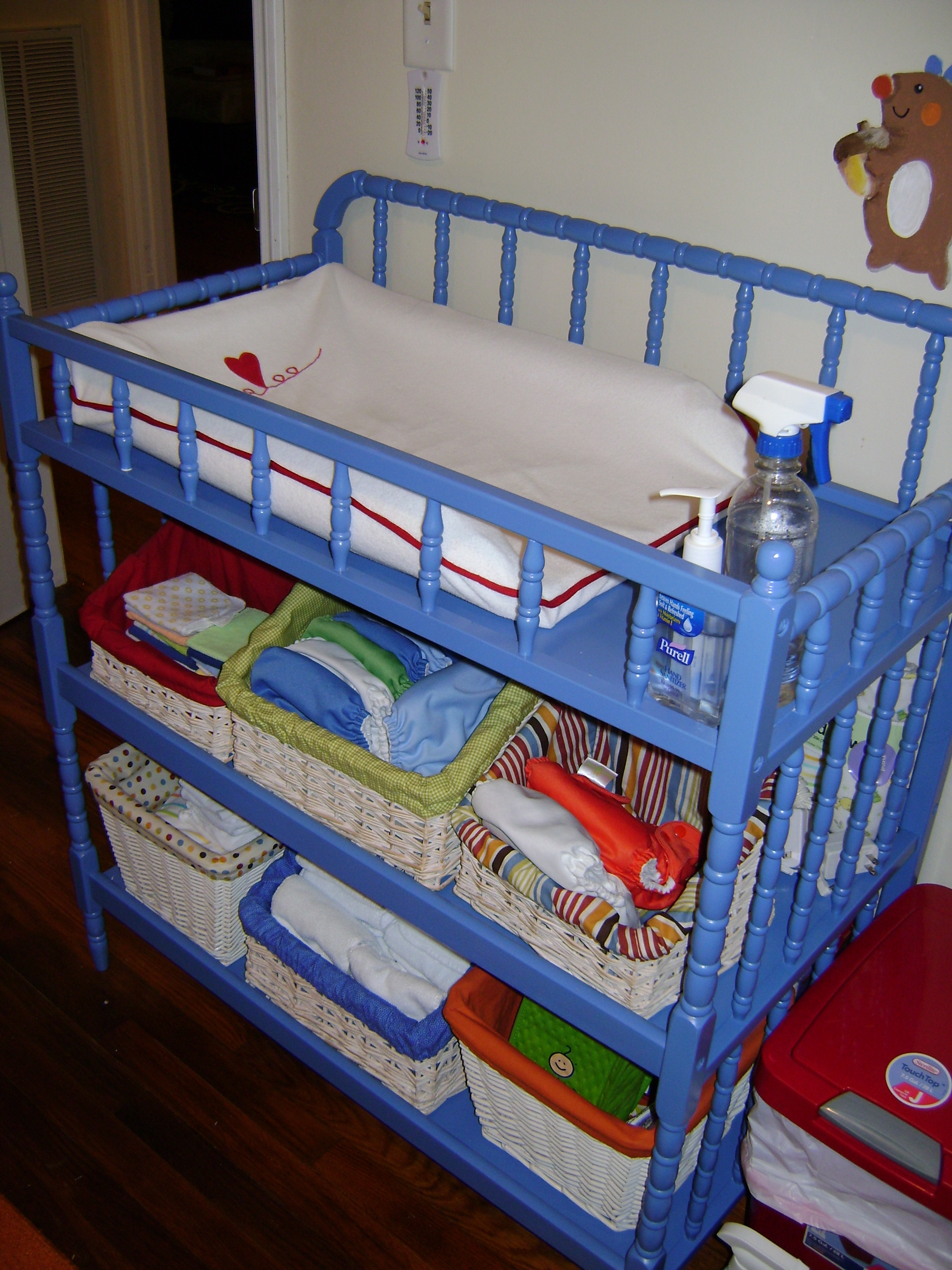 2. Changing table. While I was out of town last weekend Stephen painted the changing table. 🙂 We had bought the paint before Henry was born but had never gotten around to the project. I don’t think I have any before pictures to show you but it was white. I was fine with the white color but it was a little beat up so I decided to go with a fun color this time around.