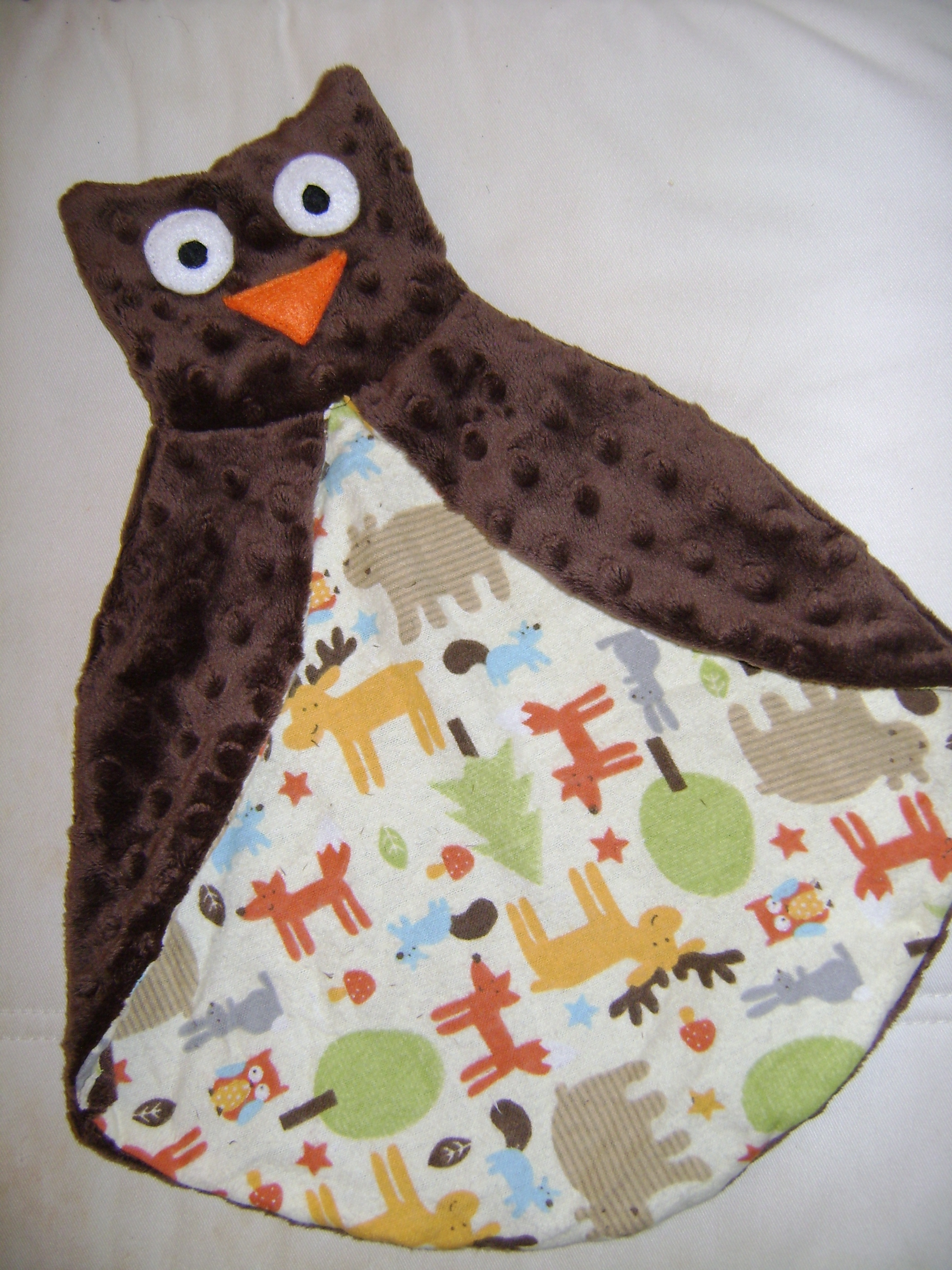 5. Owl security blanket. So this is what I made with the fabric that I showed you last week. Seeing Henry smile and cuddle up to his soft owl put a smile on my face.