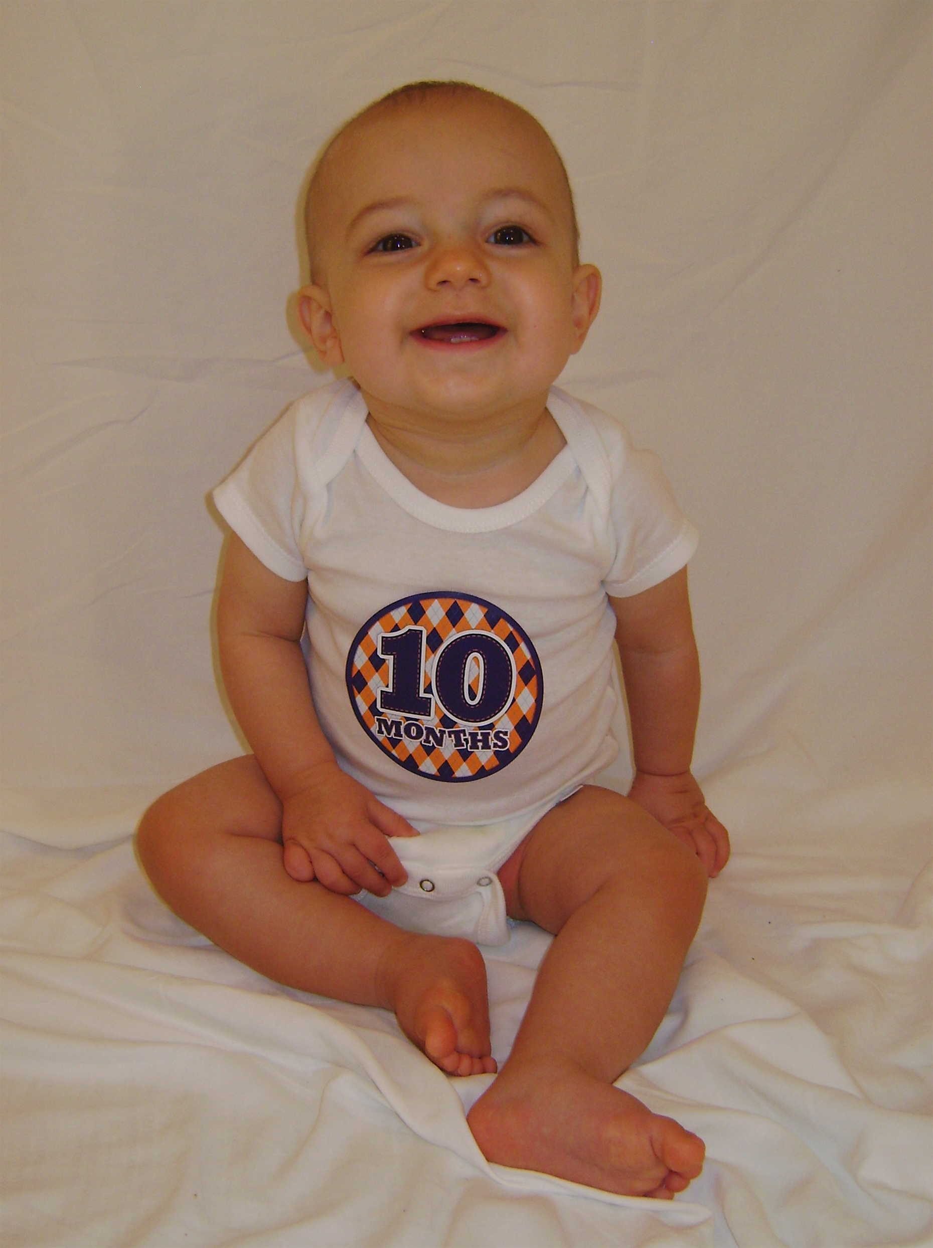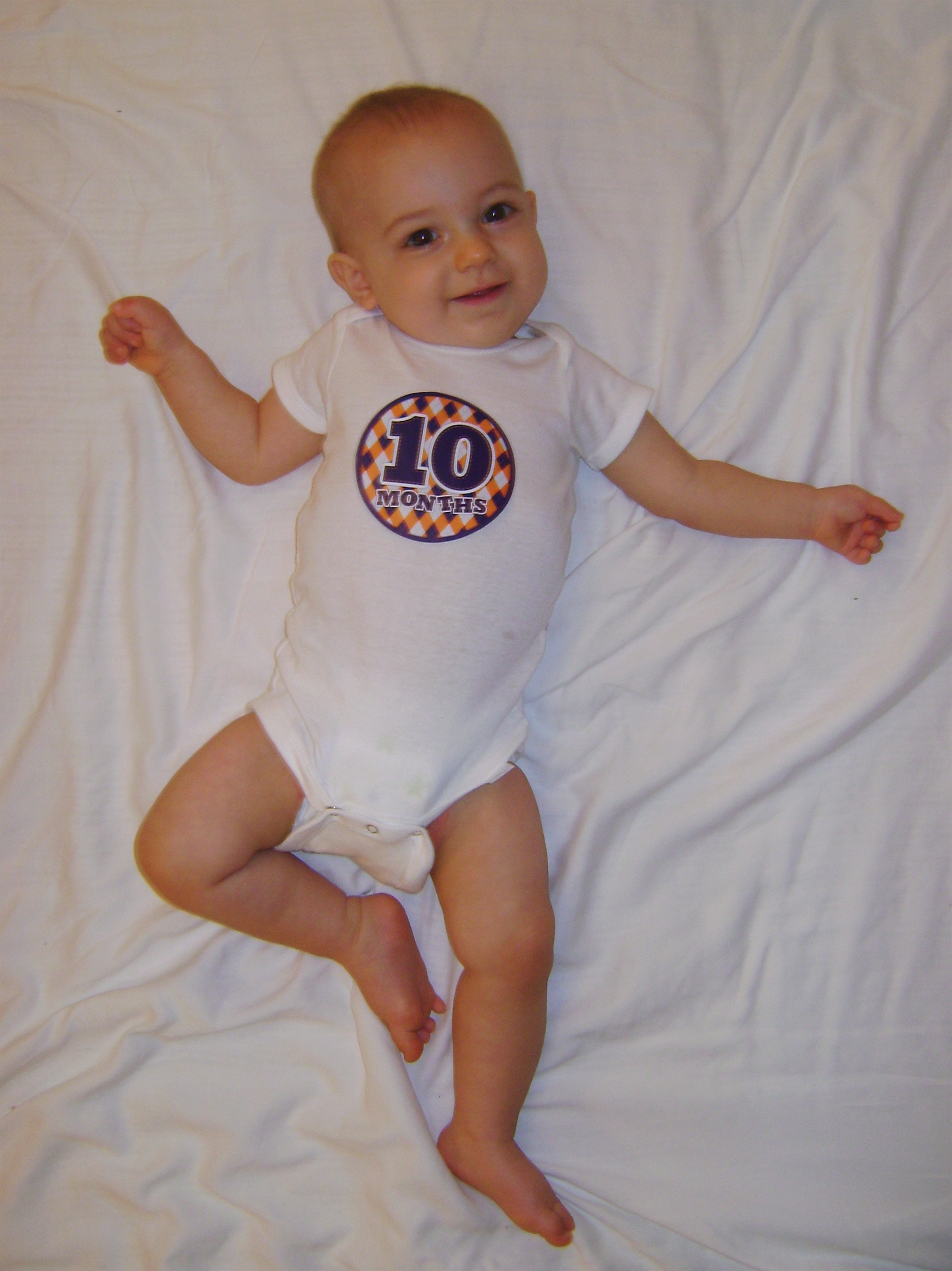 - Either didn’t grow this month or you were too wiggly and we didn’t get accurate measurements (18 lb 5 oz, 29″ long and 18 1/4″ head circumfrence). You are wearing 6-9 month shirts and 9-12 month pants.
