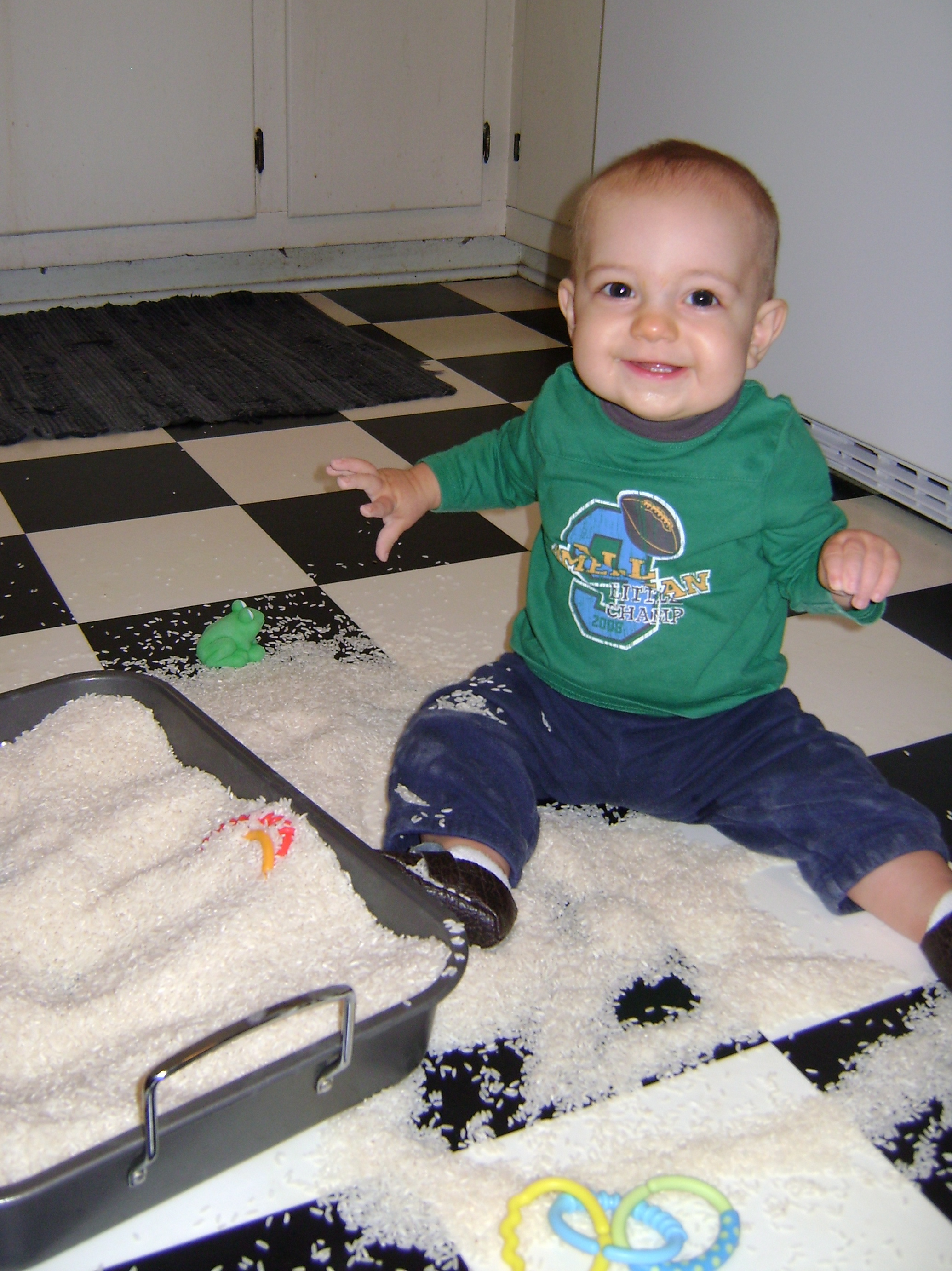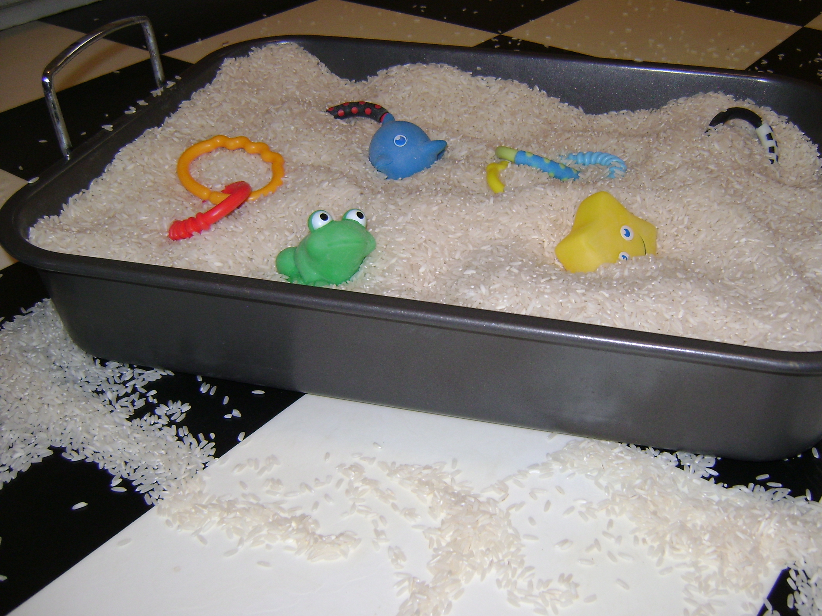 I let him take the rice out of the pan for a while before I scooped most of it back up and encouraged him to play with the rice and the toys inside the pan.