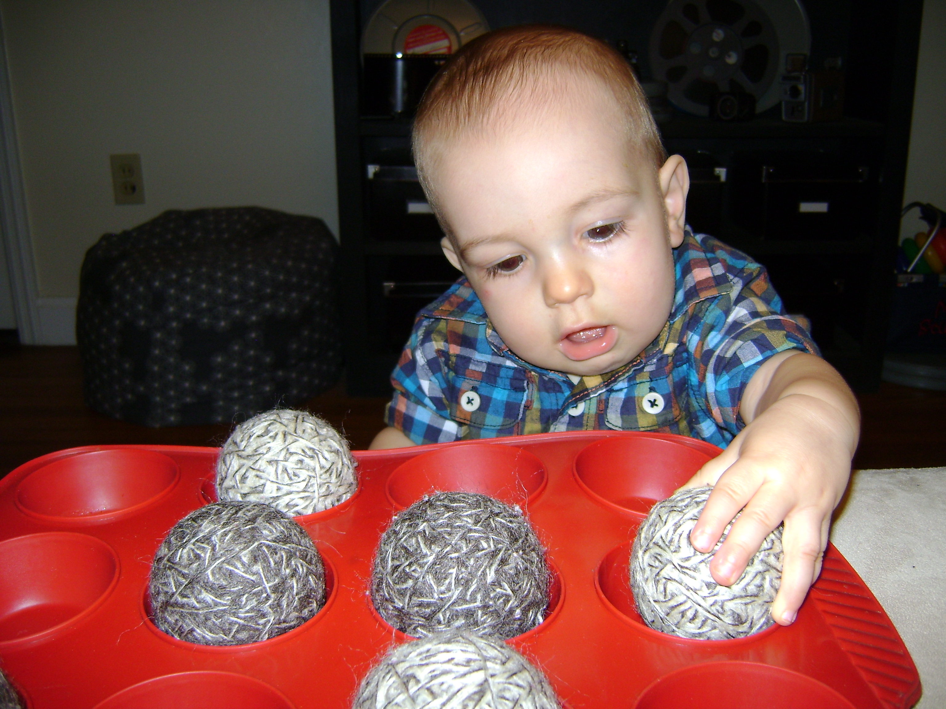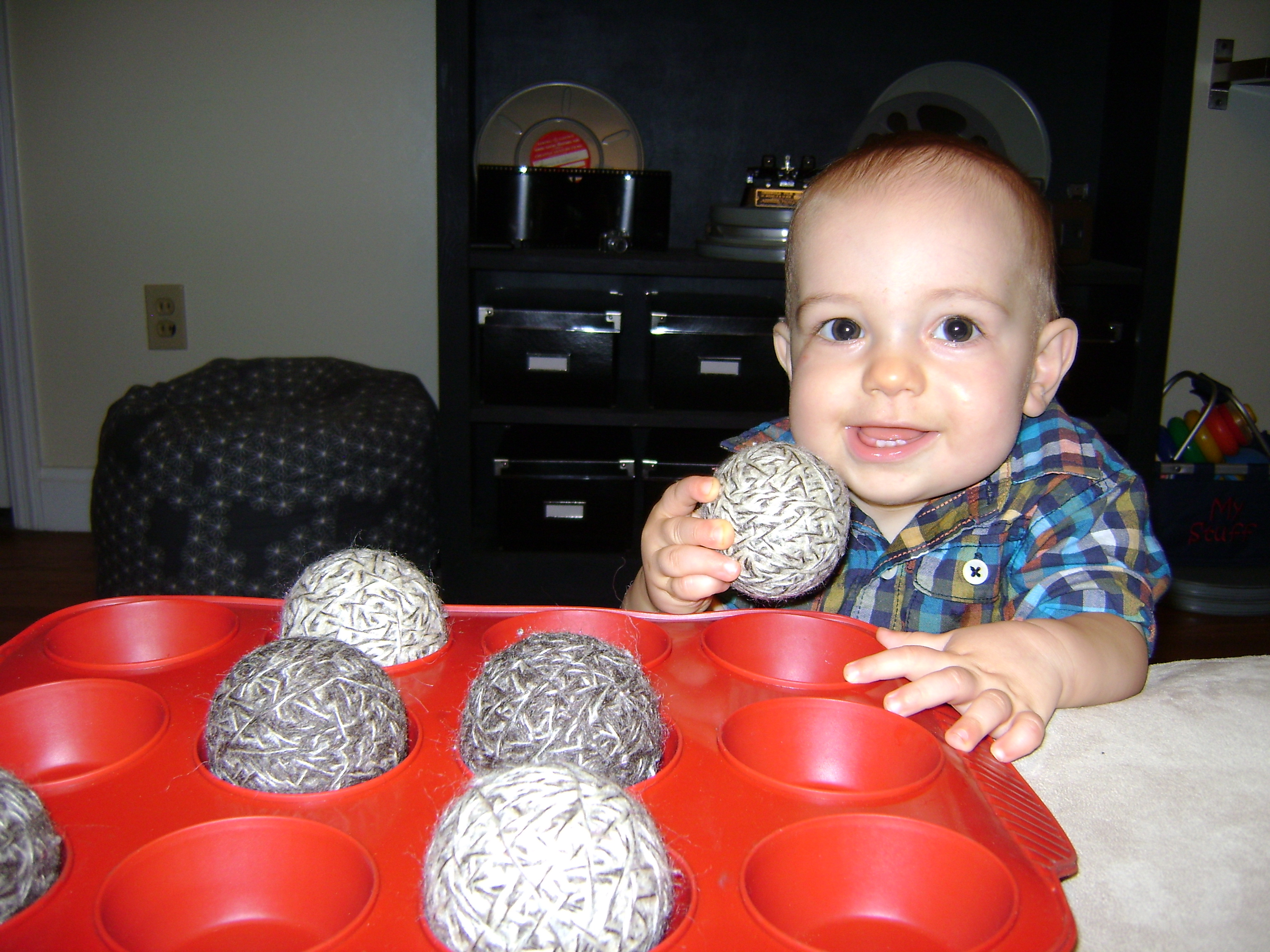 - Balls (I had 6 wool balls that are a uniform size and would fit in the muffin pan. You could also use tennis balls or the balls from a pool table) (click here to see my wool ball tutorial)