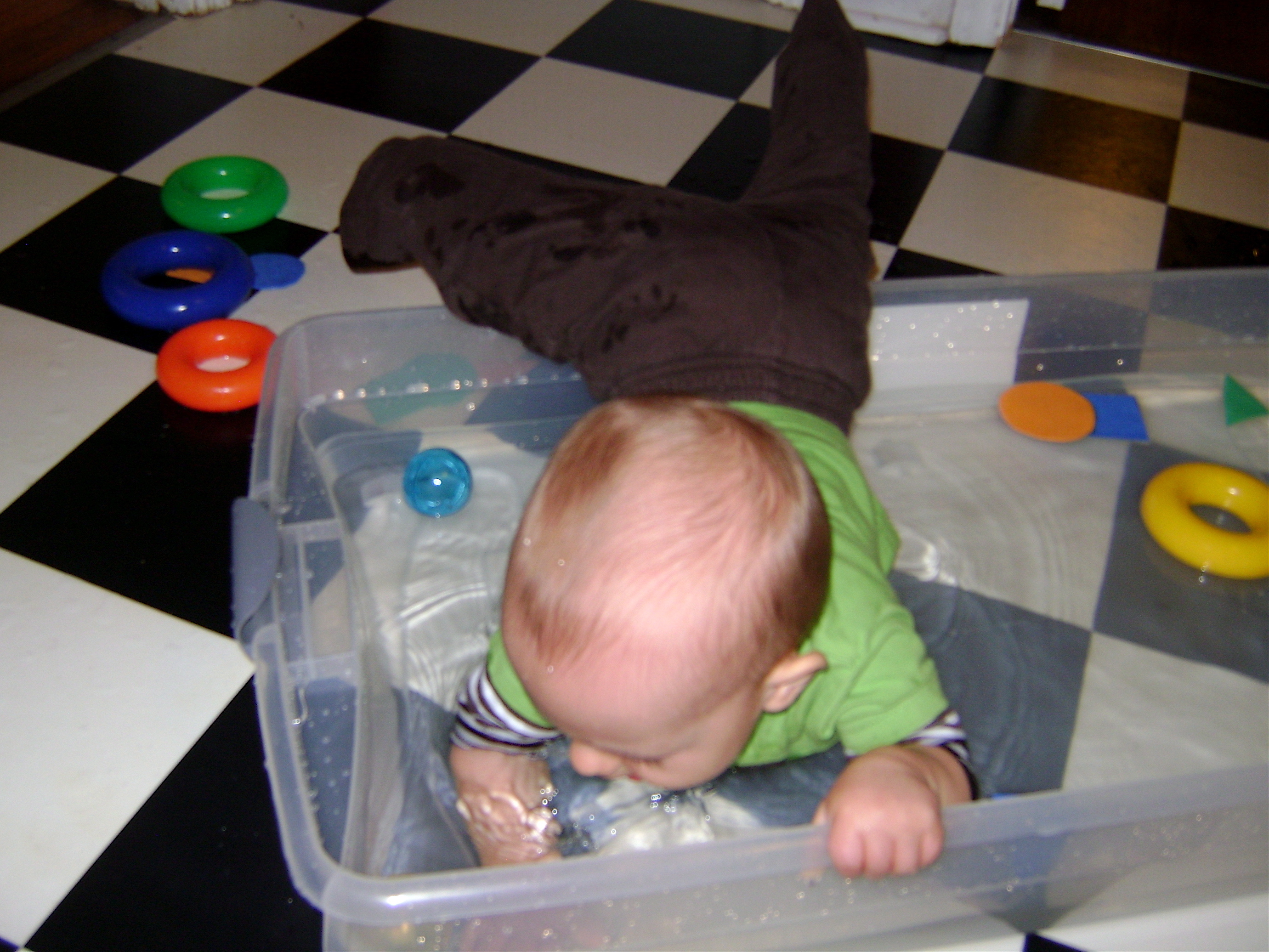 I filled a long, shallow plastic bin with water and put in some plastic rings and balls that would float on the water. I also cut shapes out of different colored sheets of foam and added them to the bin.