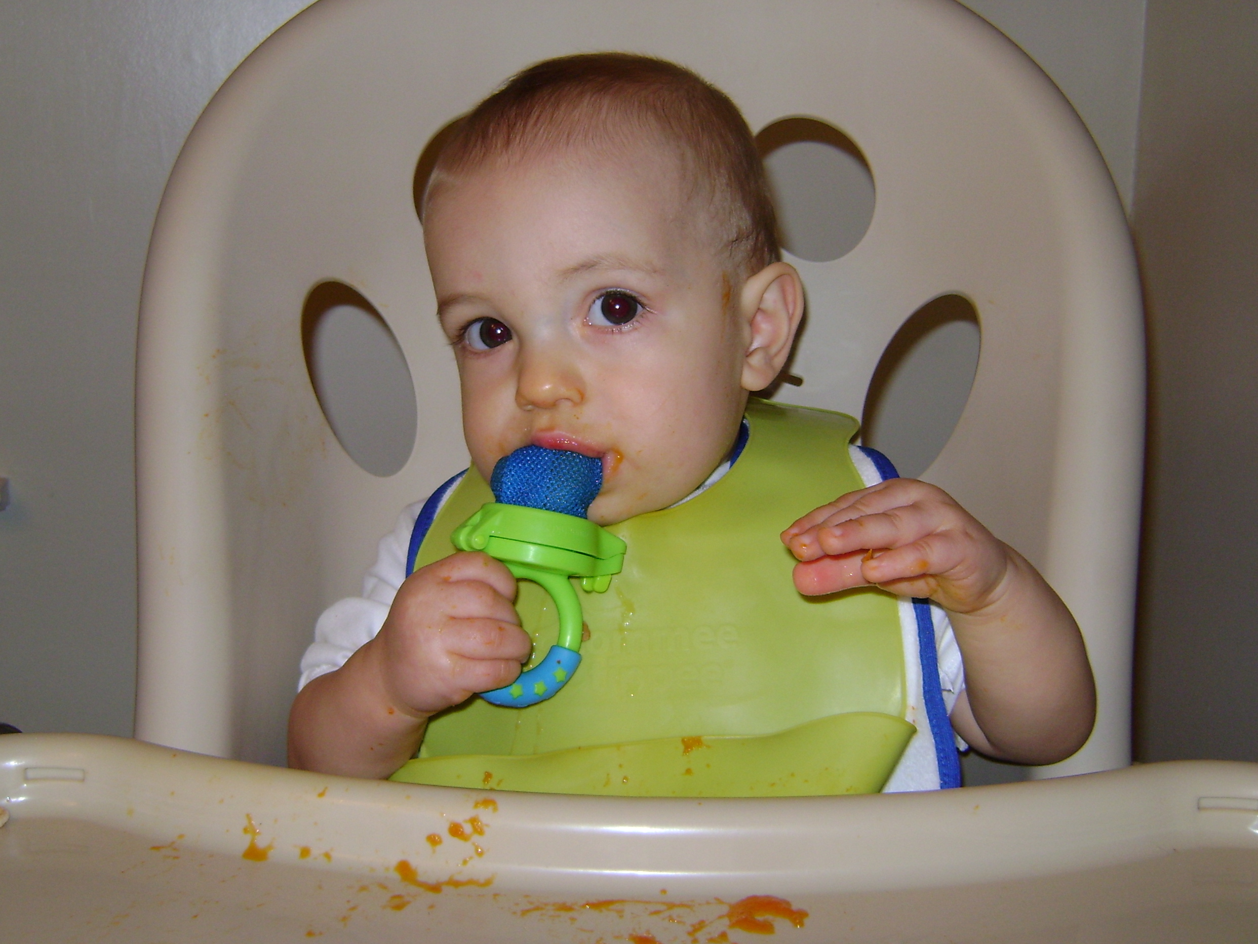 2. Popsicle – Henry’s favorite new treats are “popsicles”. I have lots of pureed fruits that I have frozen in ice cube trays. I put a cube in his mesh bag and let him suck and chew to his hearts content. Henry does not like cold teething toys so these sweet “popsicles” have been a great help when he got three new teeth in eight days.
