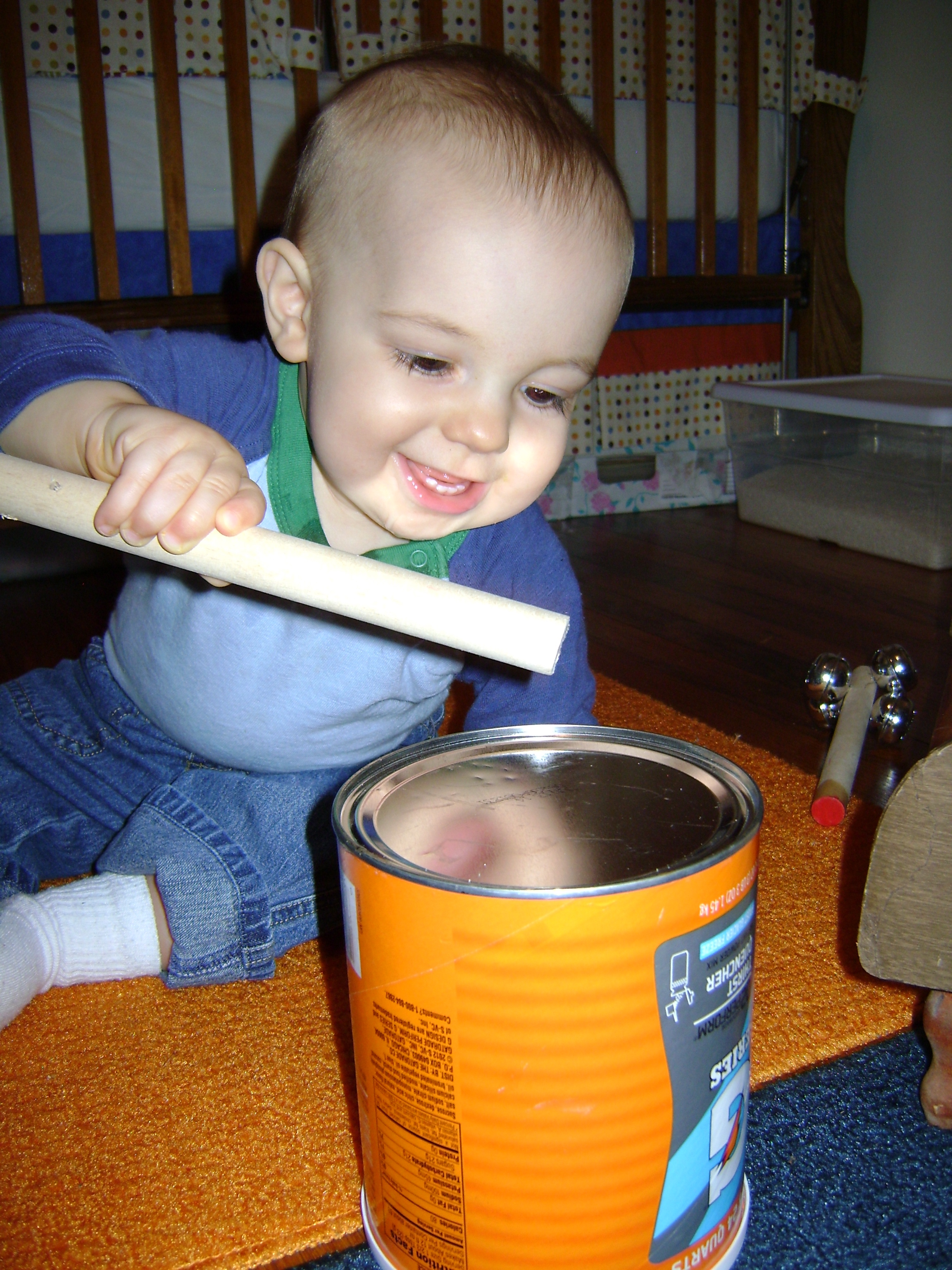 Henry likes music but didn’t have very many musical instruments so I decided to make a few more for him to play with. As you can see in the picture below I filled two empty baby food jars with dry rice to make some shakers. I had Stephen drill a few holes through dowel rods and I tied jingle bells to them. And finally I used an empty Gatorade tub as a drum.