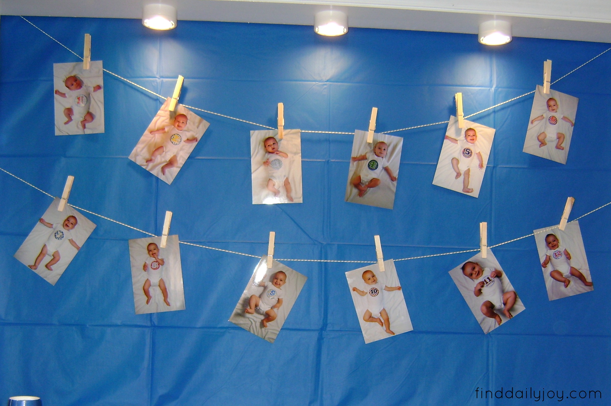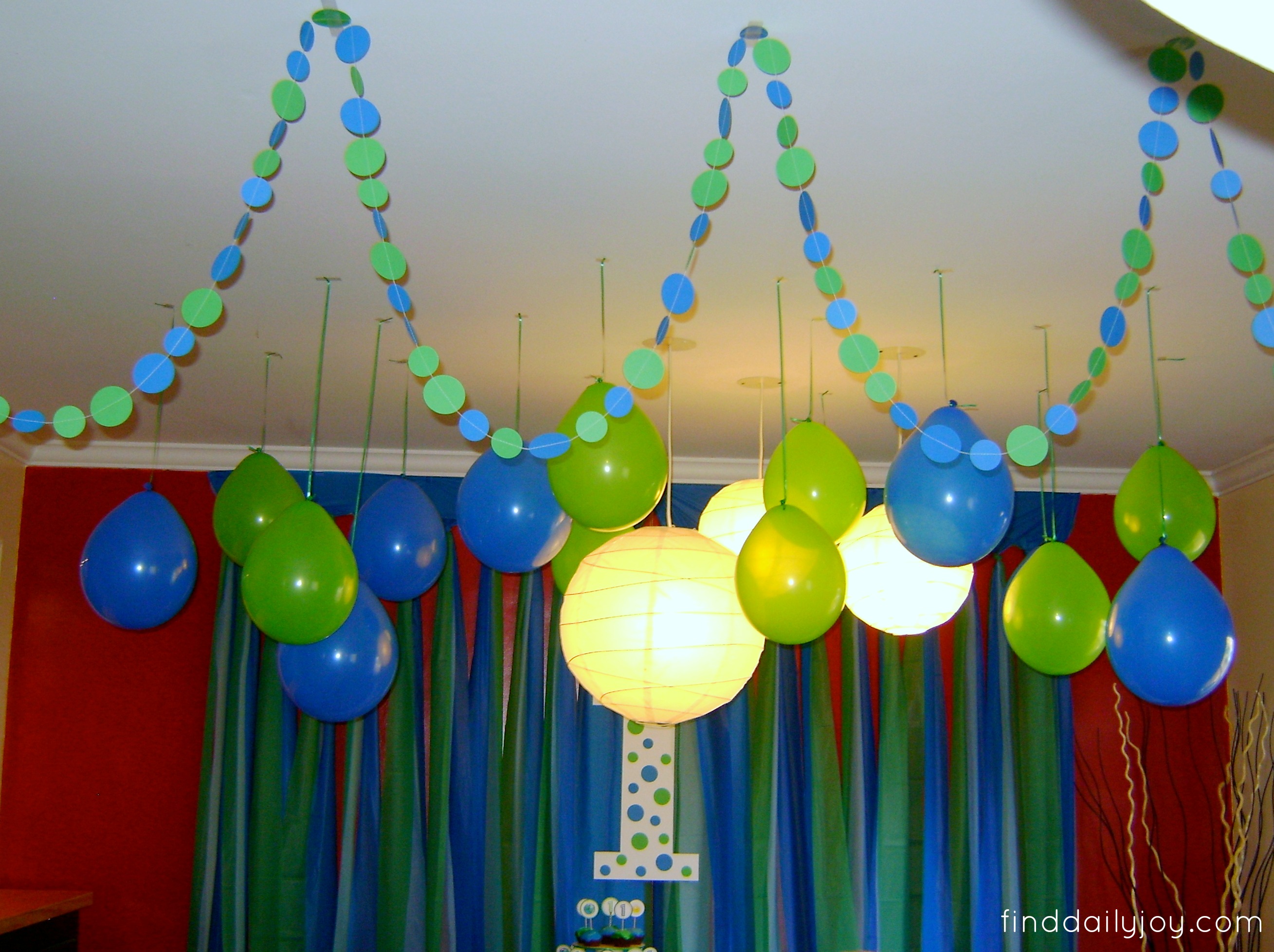 I cut a giant number 1 out of white poster board and glued on circles cut out of blue and green card stock. Then I hung the number up over my background using bakers twine.
