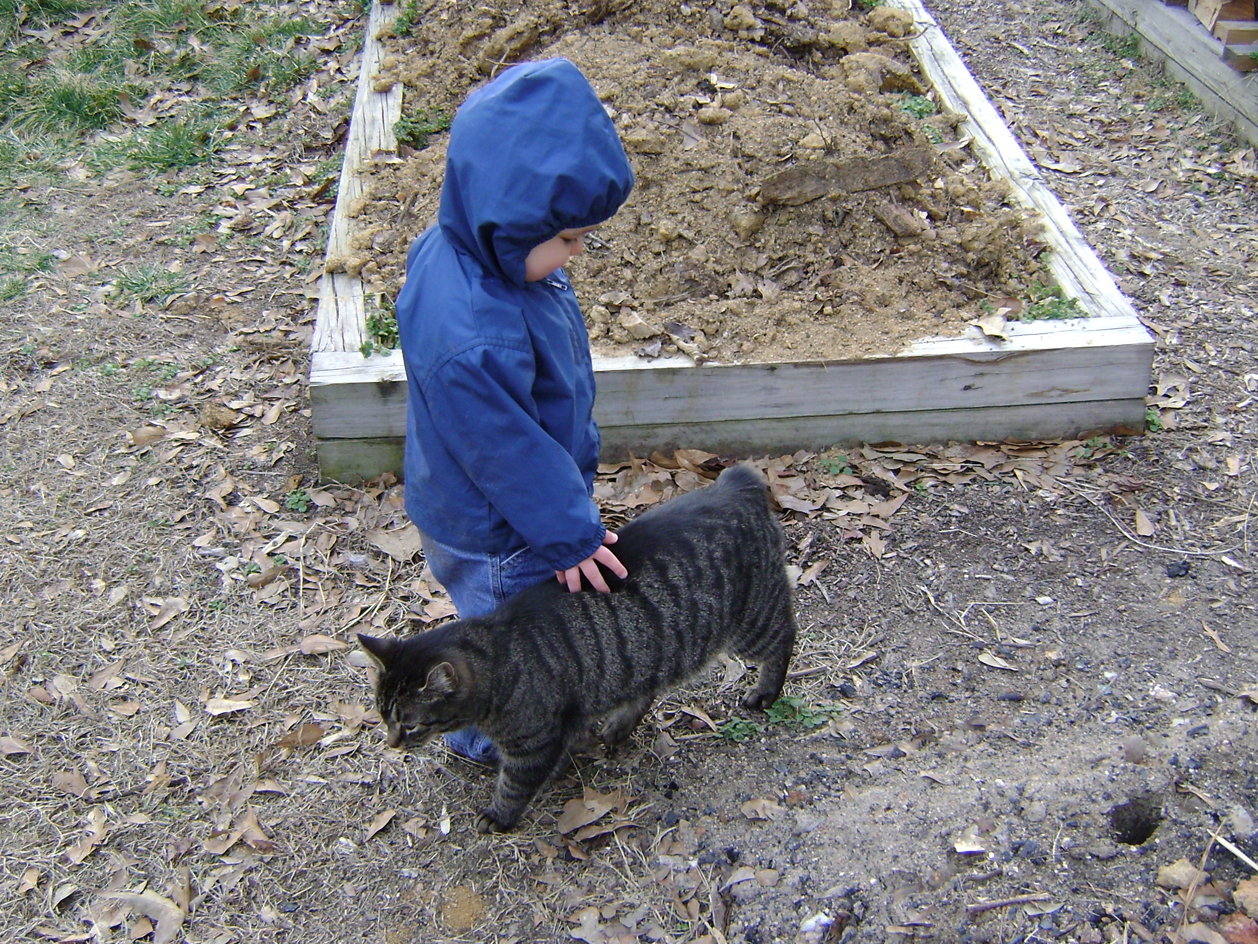 2. Cat – A stray, tailless cat has been hanging around our house lately. It is very friendly and will often come up to us and let us pet it. Henry chases after that cat and then turns around a runs away expecting the cat to chase after him.