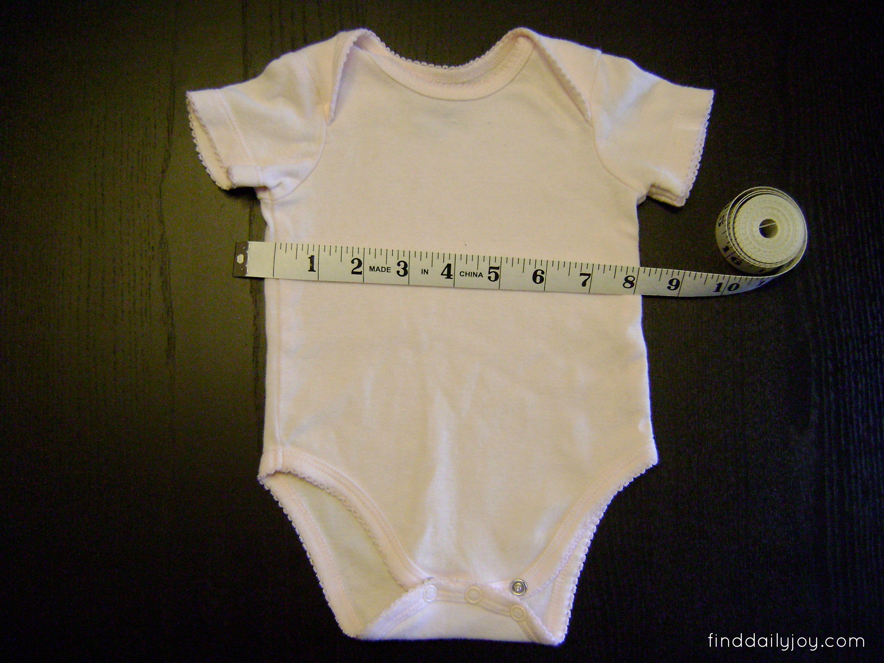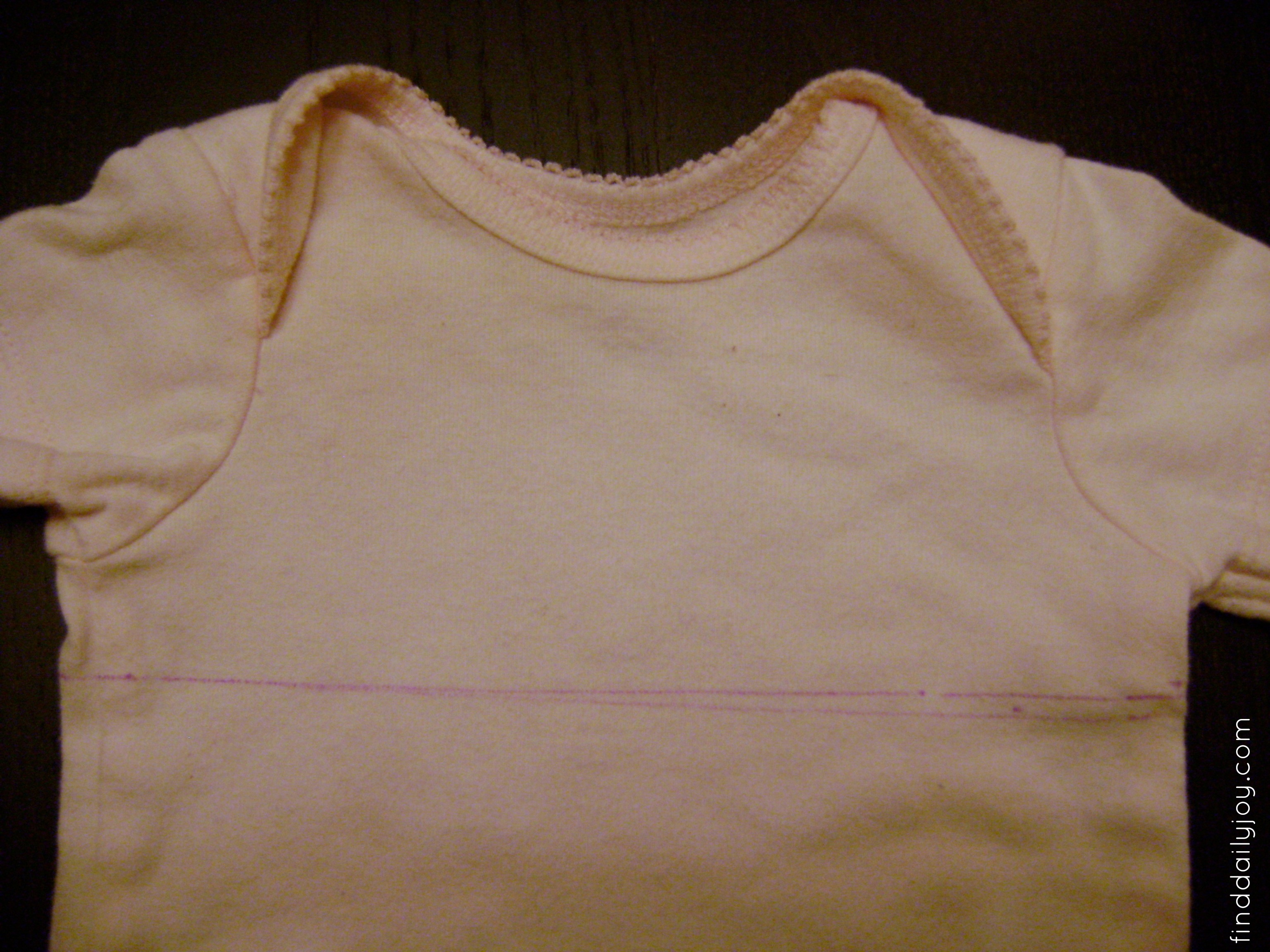 With a disappearing ink fabric pen draw a line across the front and back of the onesie indicating where you want the top of the skirt to be attached.  To help you make a straight line you may want to measure the same length down from under each sleeve.  As you can see, my attempt to eyeball the line the first time didn’t work out.