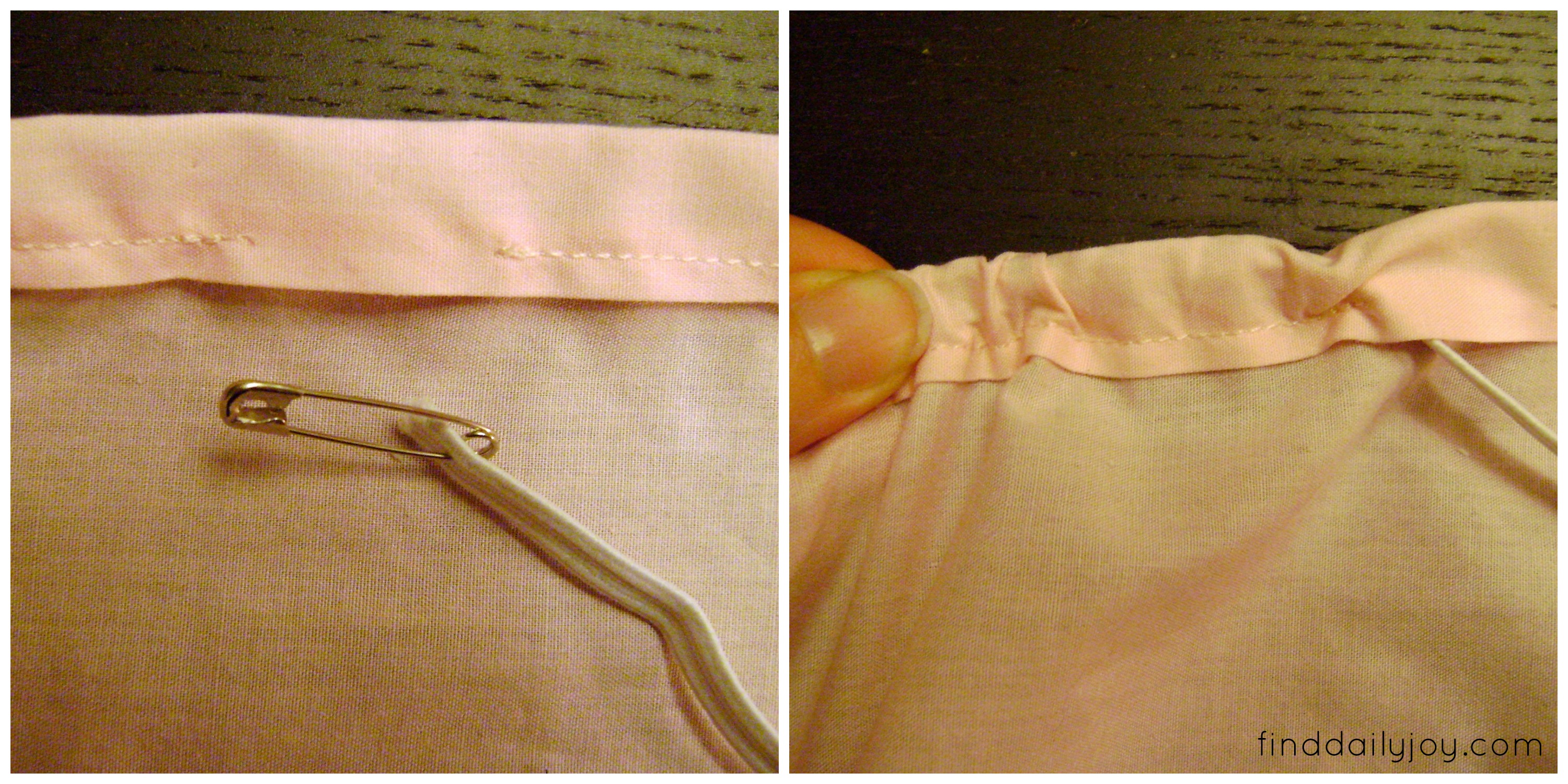 Cut your elastic into two 22 1/2″ lengths. Attach a safety pin to an end of one of the pieces of elastic and insert the pin into the 1″ opening. Use the safety pin to help you pull the elastic through your casing. The elastic will stretch from one opening in the casing to another and wrap around one of the short ends of the sheet. Secure the elastic with safety pins at each opening and then repeat the process on the other side of the sheet.