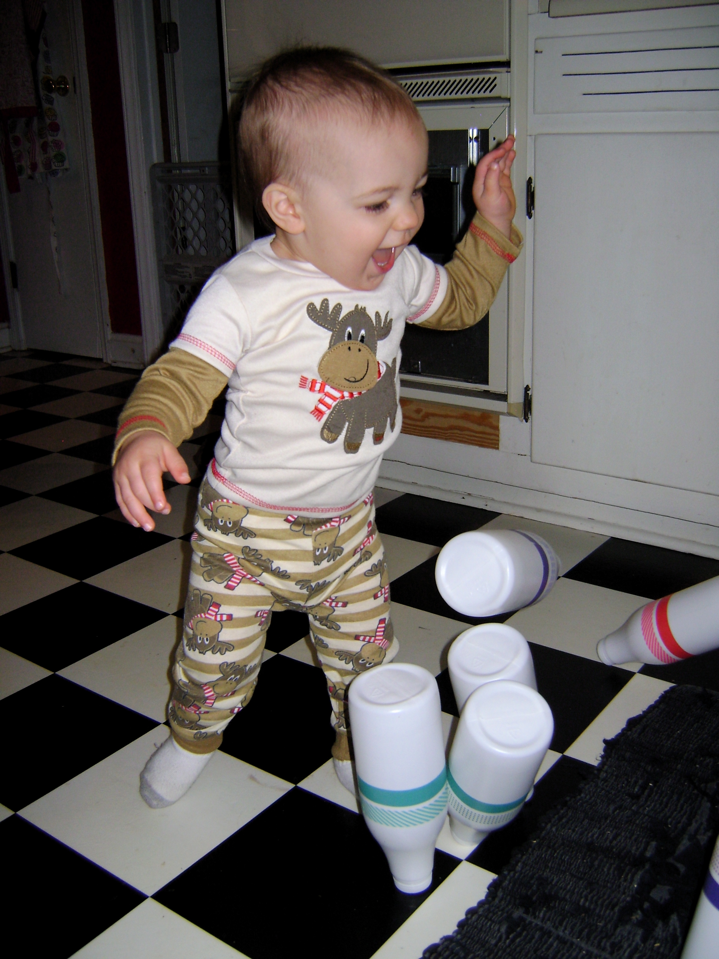 Henry has no idea how to bowl but he enjoys playing with the pins! Stephen would stack them up and Henry would knocked them down.
