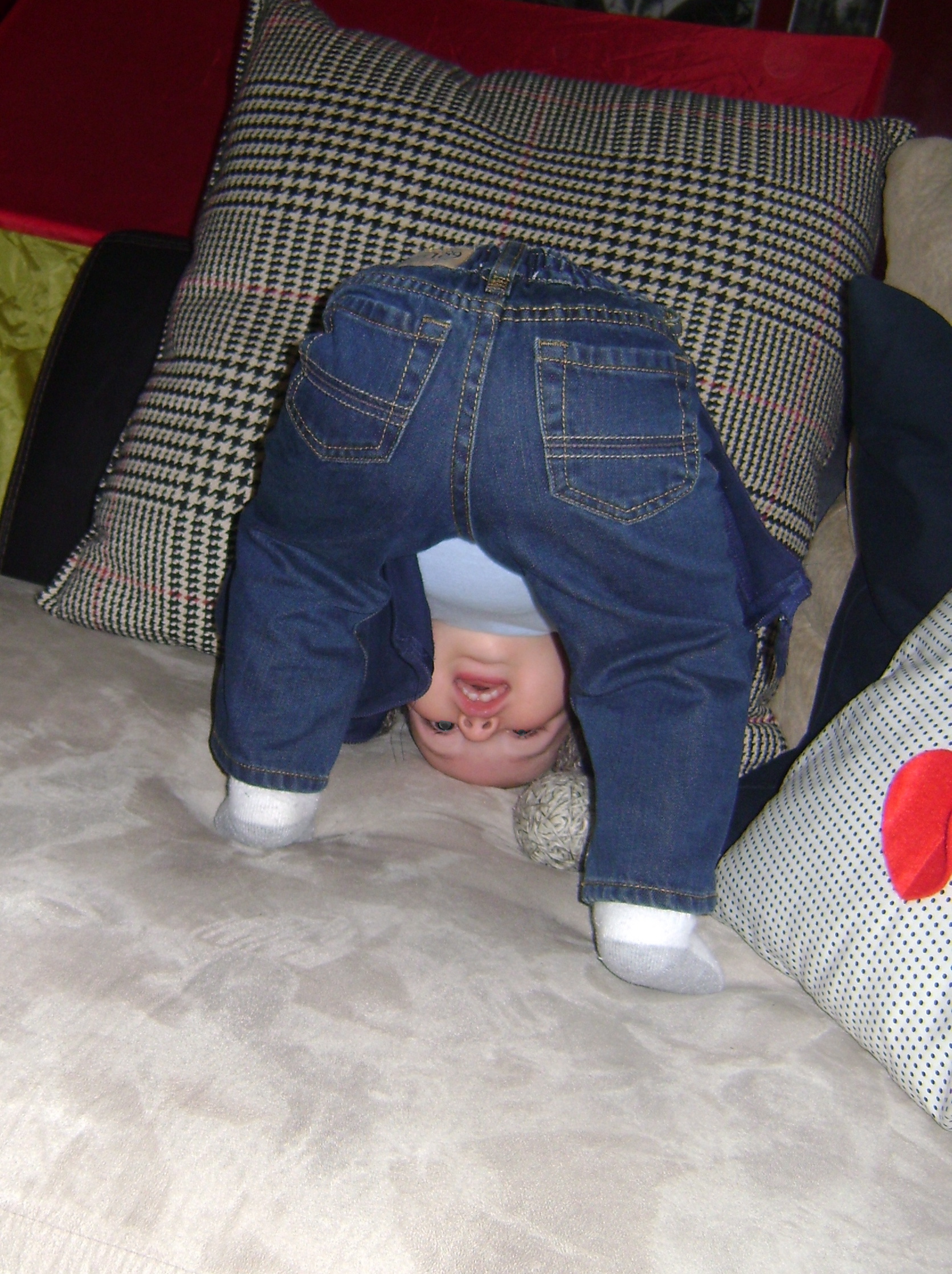 Henry is also busy testing out his physical skills. It cracks me up when he steps up on top of something that is only a few inches off the ground and grins from ear to ear as though he just scaled Mt. Everest. One of his other little tricks is to bend over and put his head and hands on the floor, then giggle as he peaks through his legs.