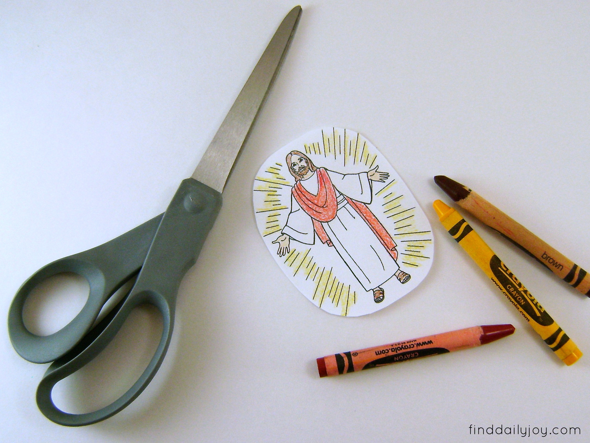 I did an internet search and found this coloring page. After downloading the picture I cropped it and resized it to about 3″ x 2.5″. You will need to print or draw (if your artistic) the picture of Jesus on white card stock. Then color the picture and cut around the outside of the drawing.