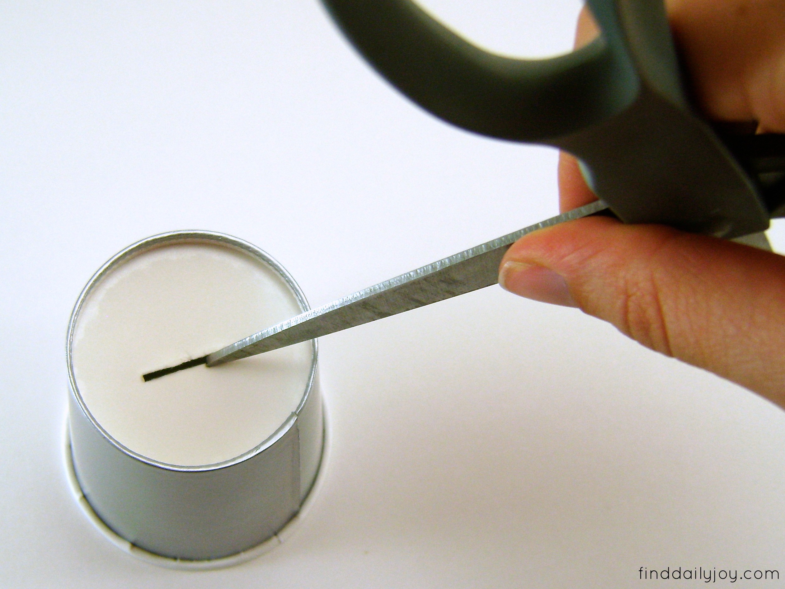 Use scissors to poke a slit into the bottom of the cup. Be sure the slit is parallel to the stone you drew on the cup.