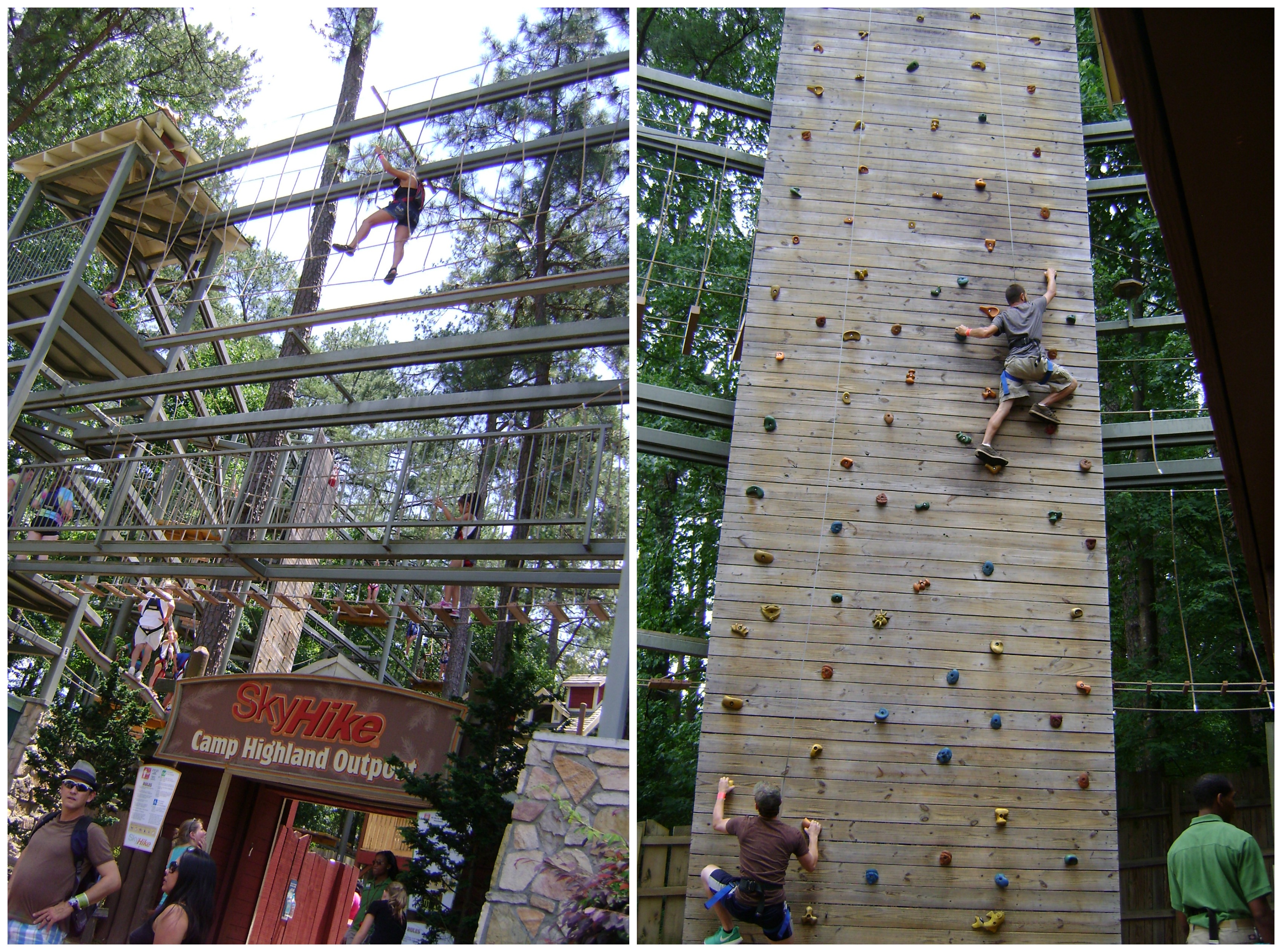 Our favorite part of the park was the three story obstacle course called Skyhike. You are fitted with a harness which is attached to a cable that runs in a track over your head. As you go through the course you have to walk across tight ropes and over swinging bridges to make your way from platform to platform. At first I held on pretty tightly to the different cables and ropes but towards the end I tested my balancing skills more by walking across things without holding on. This part of the park also had a rock climbing wall which Stephen conquered.