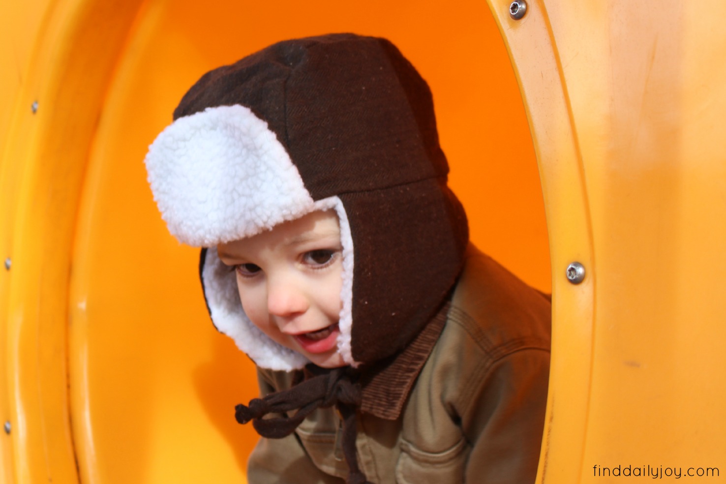 For Henry I usually fold the ear flaps down and tie the strings under his chin to keep his ears and neck nice and warm.
